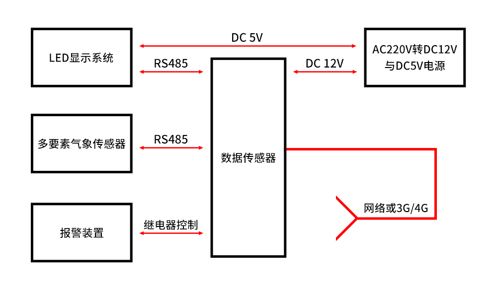 系統(tǒng)的基本組成有,電源控制系統(tǒng)、數(shù)據(jù)采集器、各類氣象環(huán)境傳感器、LED屏顯示系統(tǒng)。