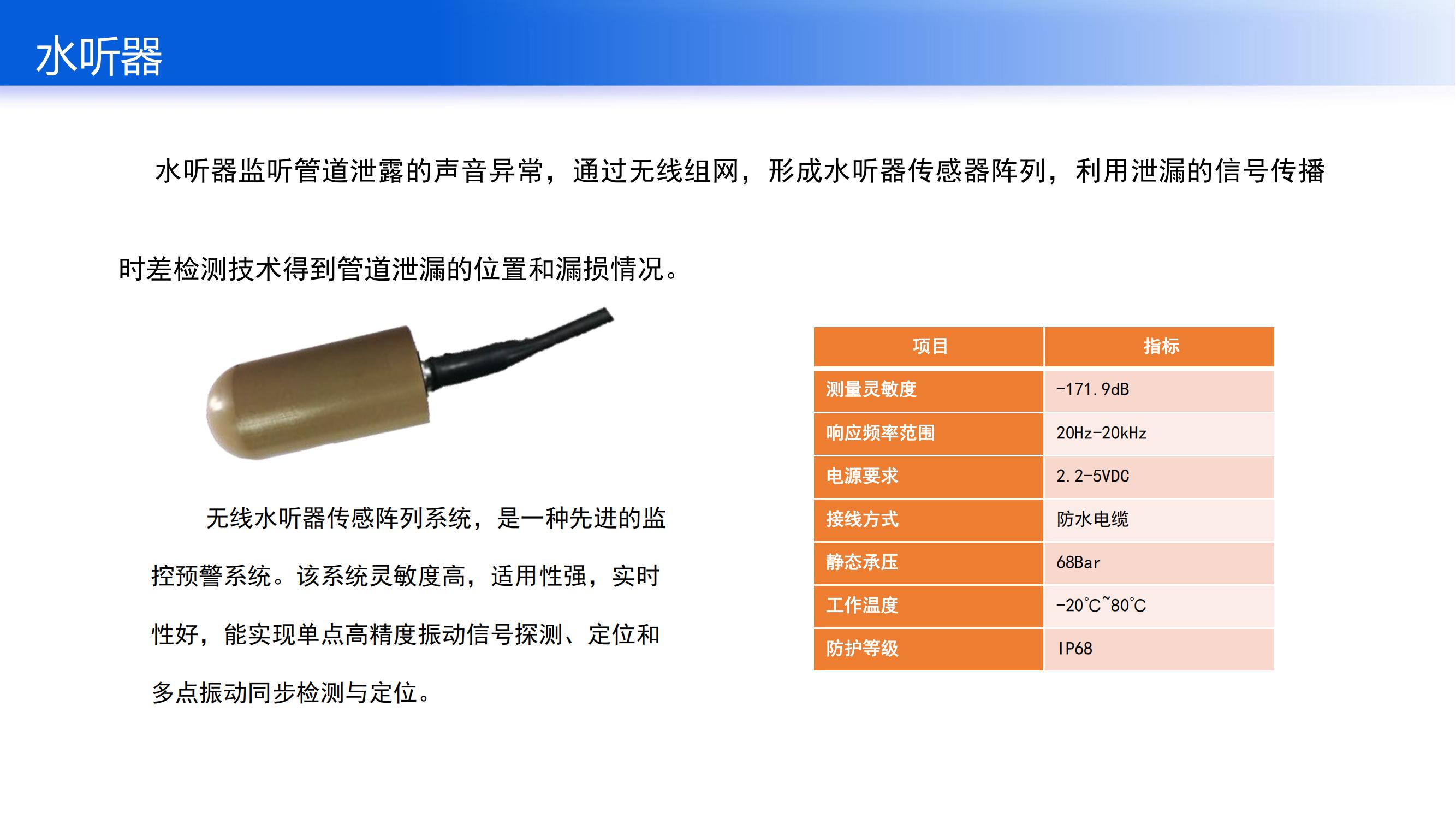 帶前放水聽(tīng)器適于長(zhǎng)距離信號(hào)傳輸。前置放大器將壓電元件的 高阻抗轉(zhuǎn)變?yōu)榈妥杩?大大...